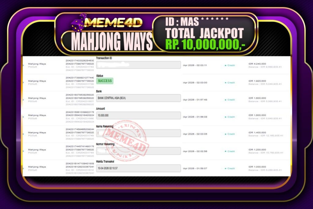 Bukti Jp MEME4D Slot Online 10 April 2026 – MEME4D merupakan situs terpercaya yang selalu membayar berapapun kemenangan semua pemain nya.