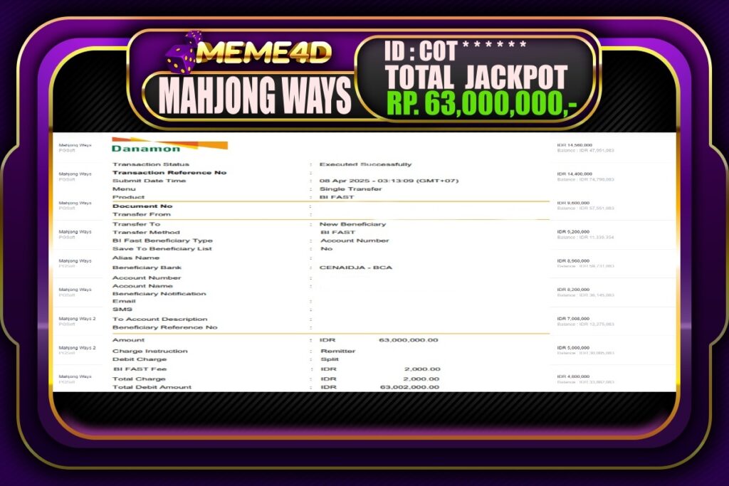 Bukti Jp MEME4D Slot Online 08 April 2025– MEME 4D merupakan situs terpercaya yang selalu membayar berapapun kemenangan semua pemain nya.