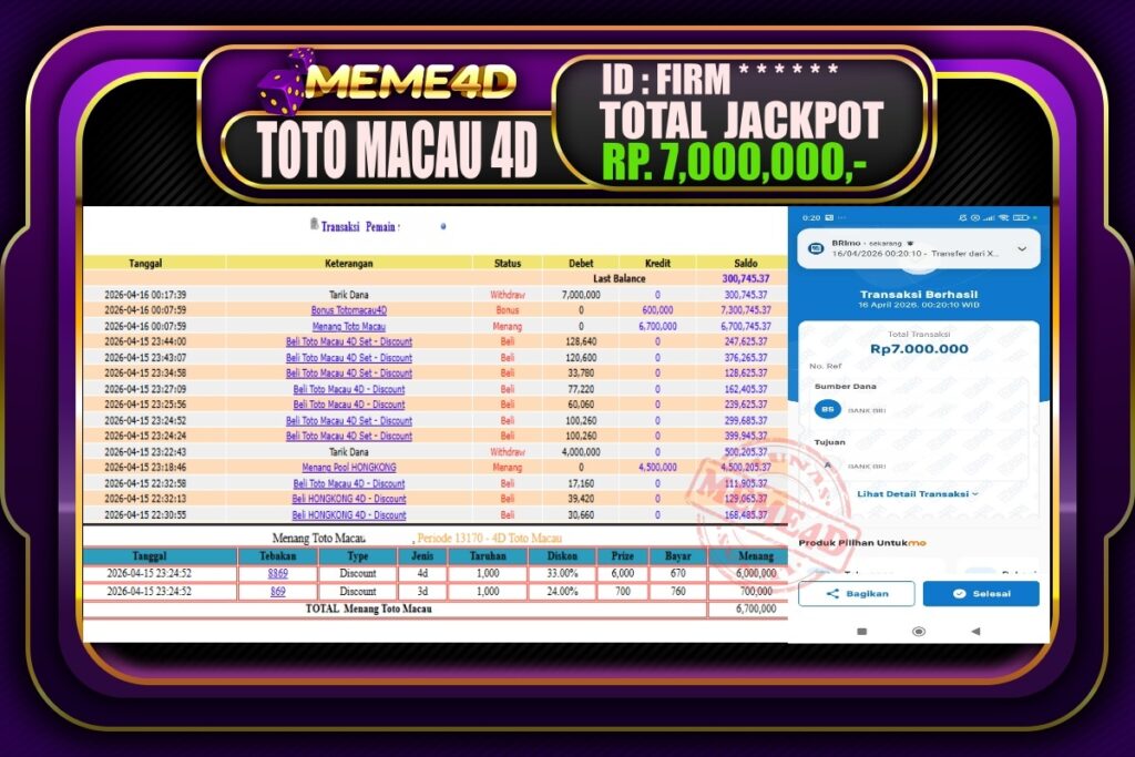 Bukti Jp MEME4D Togel Online 16 April 2026 – MEME4D merupakan situs terpercaya yang selalu membayar berapapun kemenangan semua pemain nya.
