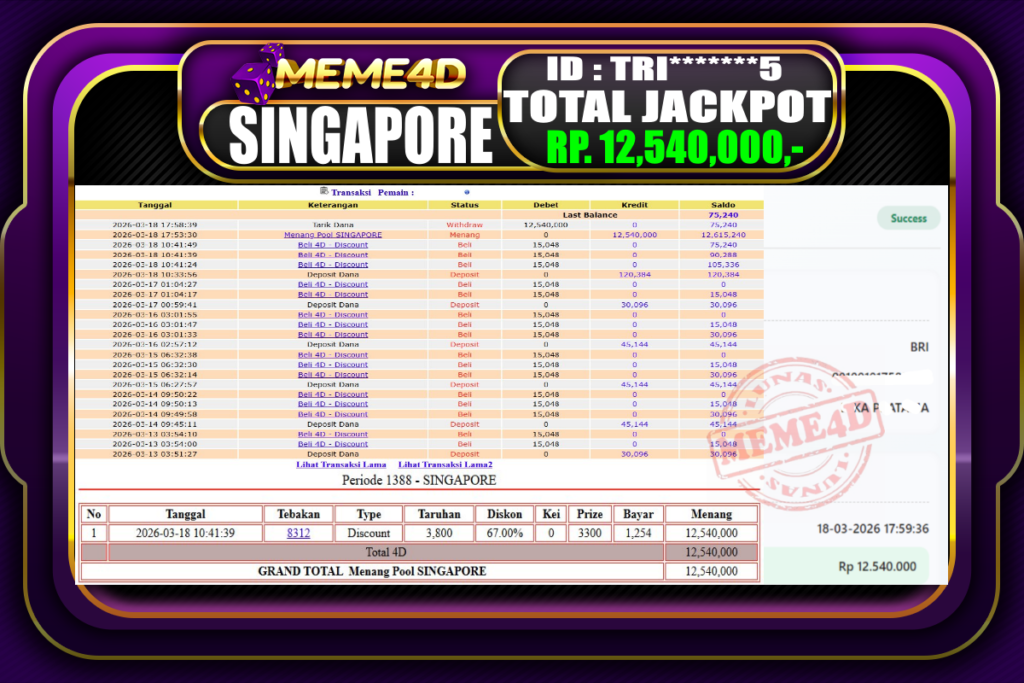 Bukti Jp MEME4D Togel Online 18 March 2026 – MEME4D merupakan situs terpercaya yang selalu membayar berapapun kemenangan semua pemain nya.